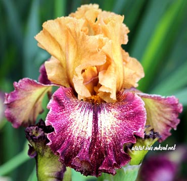 (Троцкий А.К. *2019*) ТВ, ML, НР – 78 см.. Стандарты -персиковые. Фолы - плюшевые, свекольно-фиолетовые со светлой областью цвета стандартов вокруг климентиново-красных бородок. Гофрированный.